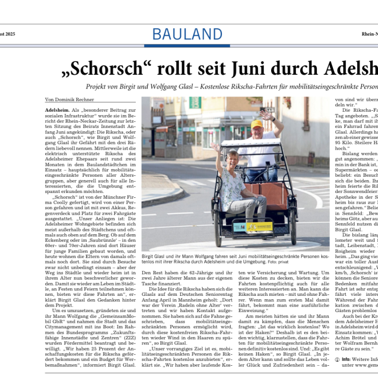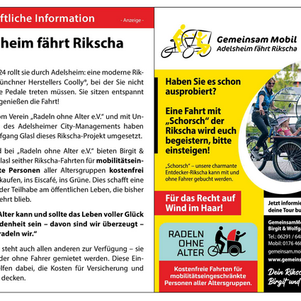 Seit der KW 27/2025 sind wir mit "Schorsch", unserer Rikscha, in unserer Gemeinde aktiv.